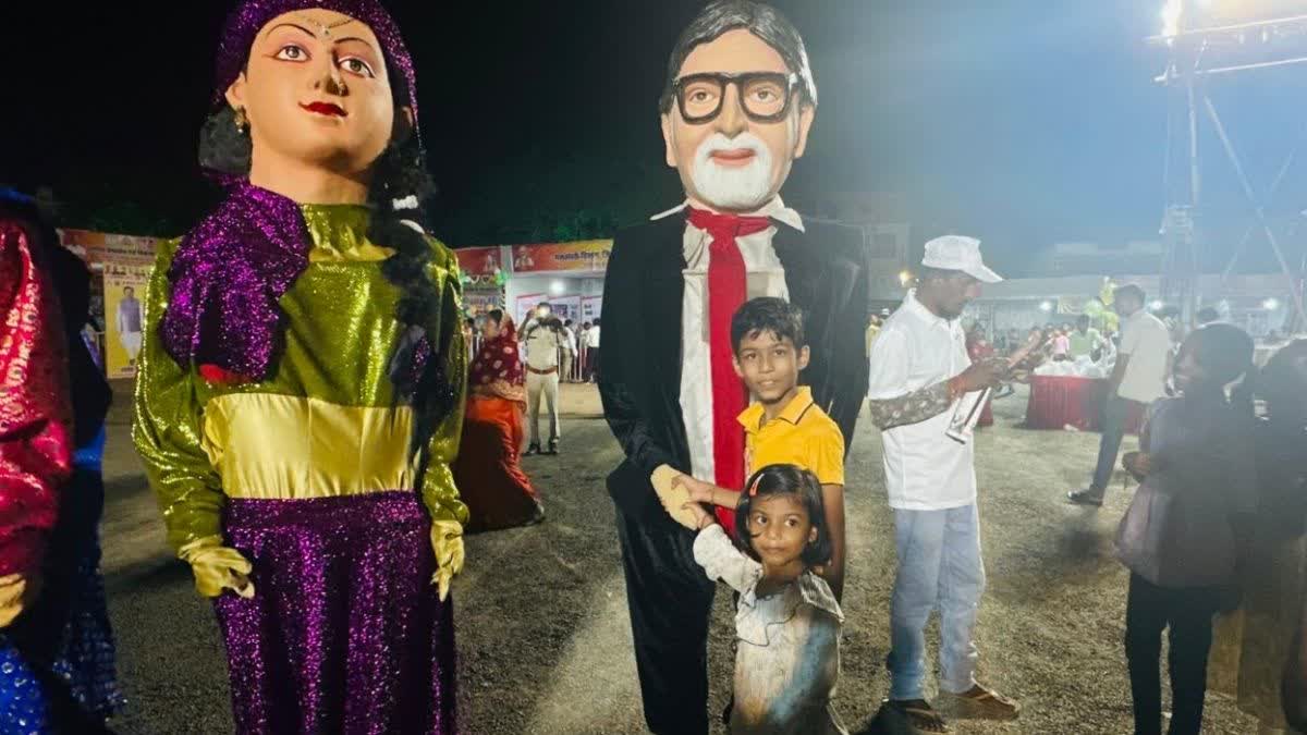 अमिताभ बच्चन सबसे लोकप्रिय : कार्यक्रम स्थल पर जब विशाल आकार के अमिताभ बच्चन आए तो छोटे बच्चों का उत्साह चरम पर पहुंच गया. कई बच्चों ने कहा कि ये “शोले वाले अमिताभ” हैं, तो कुछ ने “कौन बनेगा करोड़पति” की याद दिलाई. भीड़ में मौजूद एक स्कूली छात्रा ने मुस्कुराते हुए कहा कि हमने टीवी में तो अमिताभ जी को देखा है, लेकिन इतना बड़ा रूप कभी नहीं देखा. बहुत मजेदार लग रहा है.पुतले का आकार लगभग दस फीट ऊंचा था, जिसके कारण वो पूरे पंडाल में दूर से ही नजर आ रहा था. राजा और रानी के रूप वाली अन्य पुतले भी पारंपरिक परिधानों और आकर्षक गहनों से सजे थे. कई लोगों ने इन्हें सेल्फी पॉइंट नाम दे दिया.