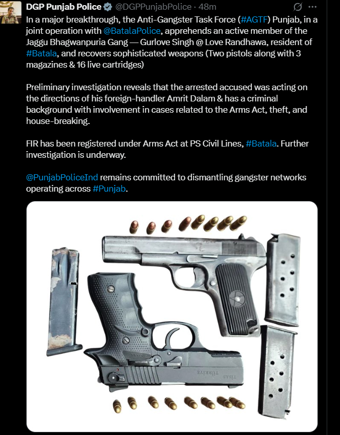 डी.जी.पी. ने बताया कि शुरुआती जांच में पता चला है कि आरोपी विदेशी हैंडलर अमृत दालम के निर्देश पर काम कर रहा था और उसका आपराधिक रिकॉर्ड है। बटाला के सिविल लाइंस थाने में आर्म्स एक्ट के तहत एफ.आई.आर. दर्ज की गई है।