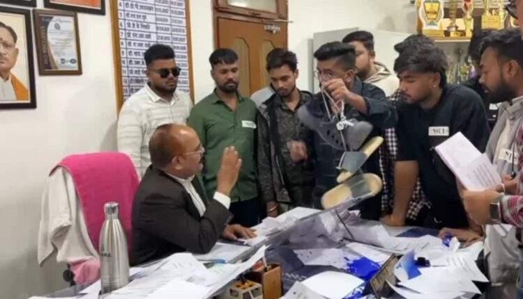 NSUI ने प्रिंसिपल डॉ विनय शर्मा का विरोध करना शुरु किया.इस दौरान सभी जबरदस्ती उनके चेंबर में घुस गए और प्रिंसिपल को जूतों की माला पहनाने की कोशिश की.NSUI कार्यकर्ताओं ने प्रिंसिपल के टेबल में बैठकर वहां रखे कई दस्तावेजों को हवा में उड़ाया.जिसके बाद माहौल तनावपूर्ण हो गया.