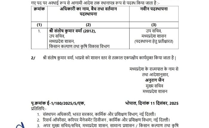 गुरुवार रात को राज्य शासन ने संतोष वर्मा को कृषि विभाग के उप सचिव पद से हटा दिया है, उन्हें जीएसडी के पूल में भेजा गया है. उनके पास किसी भी विभाग की जिम्मेदारी नहीं होगी और न ही कोई काम दिया जाएगा. इसके बाद बर्खास्तगी की कार्रवाई की जाएगी.