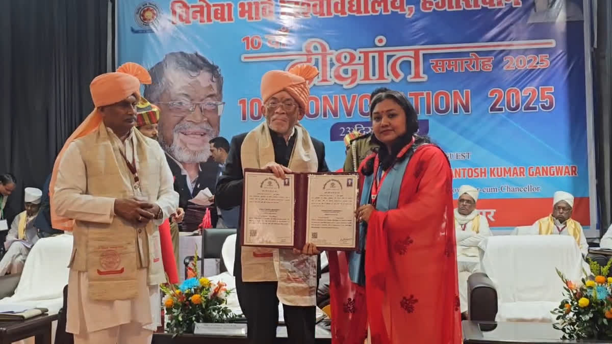 हजारीबाग: विनोबा भावे विश्वविद्यालय में 10वां दीक्षांत समारोह धूमधाम से मनाया गया. कार्यक्रम विश्वविद्यालय परिसर स्थित विवेकानंद सभागार में आयोजित किया गया. मुख्य अतिथि एवं कुलाधिपति और राज्यपाल संतोष कुमार गंगवार ने छात्रों को उपाधियां प्रदान कीं. इस दौरान एक डी-लिट, विभिन्न विषयों में 230 पीएचडी, स्नातकोत्तर टॉपरों को 94, बेस्ट ग्रेजुएट को एक तथा वोकेशनल टॉपरों को 21 उपाधियां दी गईं. कुल 347 उपाधियां वितरित की गईं. सभी टॉपरों को स्वर्ण पदक से सम्मानित किया गया.