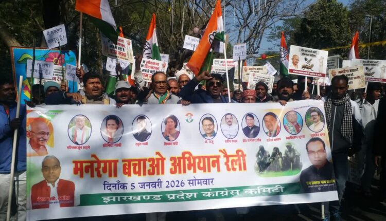 रांची: प्रदेश कांग्रेस MGNREGA योजना का नाम बदलने को लेकर रांची में विरोध प्रदर्शन कर रहे हैं. केंद्र सरकार द्वारा बदली गई योजना मनरेगा की जगह विकसित भारत जी राम जी को लेकर प्रदेश भर के कांग्रेस कार्यकर्ताओं ने राजधानी रांची में मनरेगा बचाओ अभियान रैली की शुरुआत की. रांची के मोरहाबादी मैदान के बापू वाटिका स्थित राष्ट्रपिता महात्मा गांधी की प्रतिमा के पास प्रदेश अध्यक्ष केशव महतो कमलेश के साथ-साथ सभी कांग्रेसी नेताओं को मनरेगा बचाने वाले संकल्प की शपथ दिलाई गई. इसके बाद पदयात्रा करते कांग्रेस के नेता और कार्यकर्ता लोकभवन के लिए निकल गए.