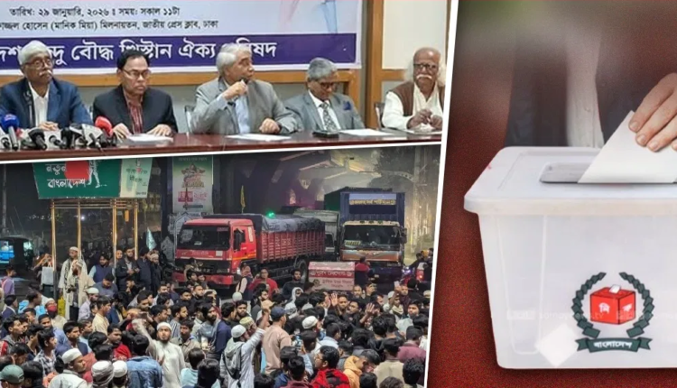 बांग्लादेश में हिंदुओं और अल्पसंख्यकों पर हो रहे अत्याचार के खिलाफ अल्पसंख्यक समुदाय 12 फरवरी को बांग्लादेश में आम चुनाव का बॉयकॉट कर सकता है. बांग्लादेश हिंदू बुद्धिस्ट क्रिश्चियन यूनिटी काउंसिल (BHDCU) ने गुरुवार को ढाका में एक प्रेस कॉन्फ्रेंस की और आरोप लगाया कि चुनाव से पहले देश में सुरक्षा की स्थिति के कारण अल्पसंख्यक बड़ी संख्या में बाहर रह रहे हैं.