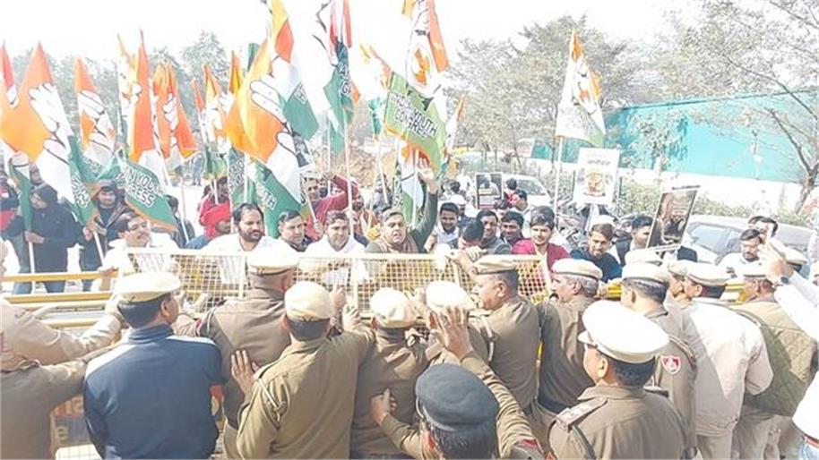 गुड़गांव): संसद में नेता प्रतिपक्ष राहुल गांधी को सवाल न पूछने देने के विरोध में आज कांग्रेसियों ने गुड़गांव में जमकर बवाल काटा। युवा कांग्रेस ने भाजपा के गुड़गांव जिला कार्यालय गुरुकमल पर जमकर प्रदर्शन किया। कांग्रेसियों ने भाजपा सरकार और प्रधानमंत्री नरेंद्र मोदी के खिलाफ जमकर नारेबाजी की।