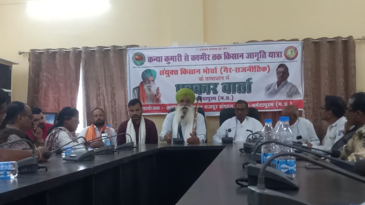 नर्मदापुरम: संयुक्त किसान मोर्चा (गैर राजनैतिक) के तत्वाधान में 7 फरवरी से निकाली जा रही कन्या कुमारी से कश्मीर तक किसान जागृत यात्रा नर्मदापुरम पहुंची. यात्रा में राष्ट्रीय किसान नेता सरदार जगजीत सिंह डल्लेवाल भी पहुंचे. इस दौरान ईटीवी भारत ने उनसे किसानों के विभिन्न मुद्दों को लेकर चर्चा की. उन्होंने बताया कि, ”यात्रा 20 मार्च को दिल्ली में समाप्त होगी और देश के लाखों किसान रामलीला मैदान में प्रधानमंत्री के खिलाफ आवाज उठाते नजर आएंगे.”