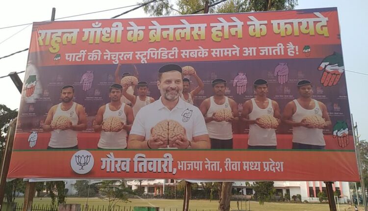 शनिवार को शहर के टीआरएस कॉलेज चौराहे पर लगा पोस्टर सोशल मीडिया पर सर्कुलेट हो रहा है. बताया गया कि, यह पोस्टर बीजेपी नेता व भारतीय जनता पार्टी युवा मोर्चा के पूर्व राष्ट्रीय अध्यक्ष गौरव तिवारी के द्वारा लगवाया है. इस पोस्टर के जरिए बीजेपी नेता नें राहुल गांधी पर बड़ा तंज भी कसा है. पोस्टर में लिखा गया है कि, “राहुल गांधी के ब्रेन लेस होने के फायदे” “पार्टी के नेचुरल स्टूपिडिटी सब के सामने आ जाती है” इसके साथ ही पोस्टर मे पीछे की ओर सात युवकों की तस्वीर के साथ राहुल गांधी की भी तस्वीर लगी हुई है. जिसमें युवकों के साथ राहुल गांधी हाथों में इंसानी ब्रेन लिए हुए दिखाई दे रहे हैं.