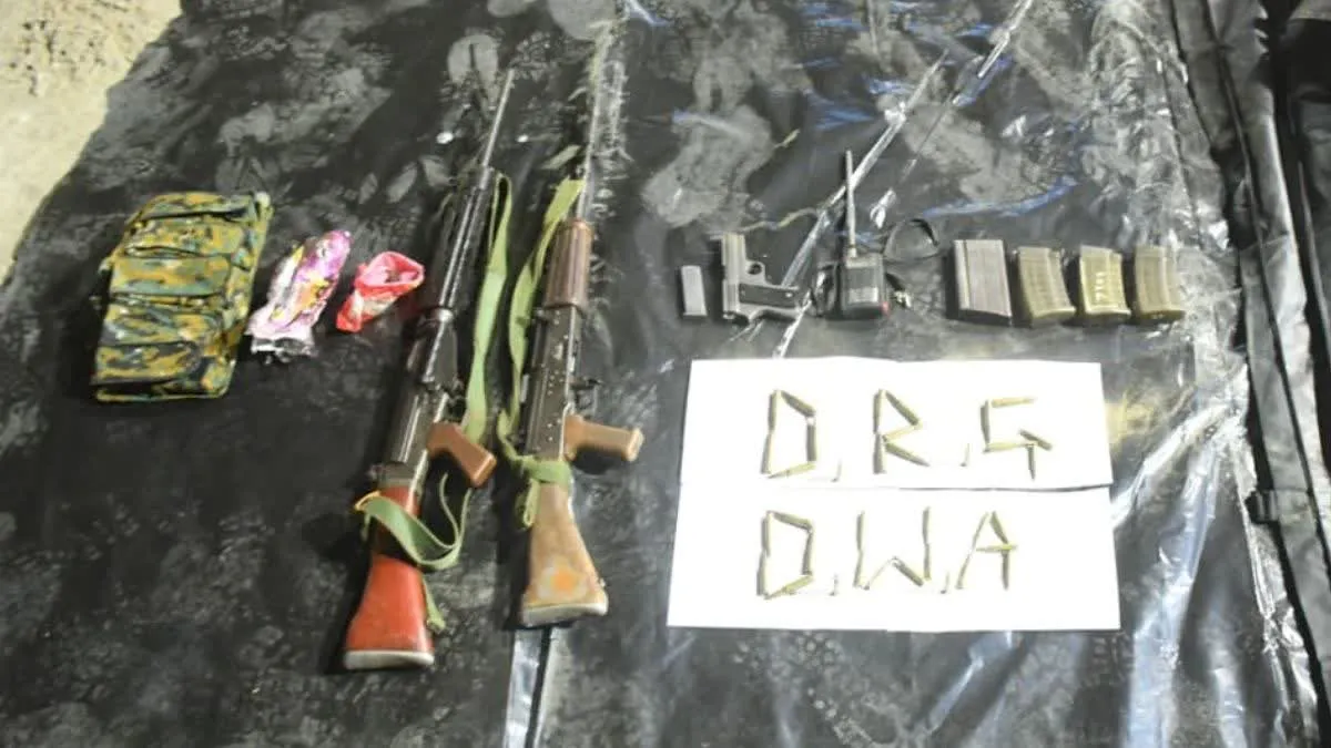 इसके अलावा मौके से बड़ी मात्रा में हथियार, गोला-बारूद और नक्सली सामग्री भी बरामद की गई. बरामद सामग्री में एक एसएलआर रायफल, एक इंसास रायफल, एक पिस्टल मय मैगजीन, एक वॉकी-टॉकी सेट, एक एसएलआर मैगजीन, छह एसएलआर जिंदा राउंड, एक एसएलआर का खाली खोखा, तीन इंसास मैगजीन, पांच इंसास जिंदा राउंड, अठारह इंसास मिसफायर राउंड, तीन इंसास के खाली खोखे, पांच पिस्टल के जिंदा राउंड, एक पिस्टल का खाली खोखा और एक पोच शामिल है.