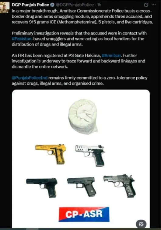अमृतसर: अमृतसर कमिश्नरेट पुलिस ने सीमा पार से नशीले पदार्थों और हथियारों की तस्करी करने वाले एक गिरोह का भंडाफोड़ किया है। इस कार्रवाई के दौरान 3 आरोपियों को गिरफ्तार किया गया है और उनके कब्जे से 915 ग्राम आईसीई (मेथामफेटामाइन), 5 पिस्तौल और जिंदा कारतूस बरामद किए गए हैं। इस संबंध में जानकारी पंजाब के डीजीपी गौरव यादव ने सांझा की है।